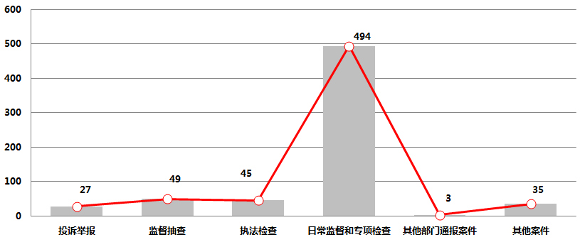 图4-5-1 全省药品生产企业日常监管情况 六、药品案件查处情况2017年,各级监管机构共查处违法药品案件总数3541件,其中一般程序案件2031件,简易程序案件1510件,货值金额907.37万元,罚款金额1075万元,没收违法所得金额524.89万元;取缔无证经营6户,捣毁制假售假窝点1个,责令停产停业16户,吊销经营许可证1件,移送司法机关案件数36件。 从案件来源看,投诉举报401件,监督抽验447件,执法检验168件,日常监管和专项检查2369件,其他部门通报60件,其他96件。