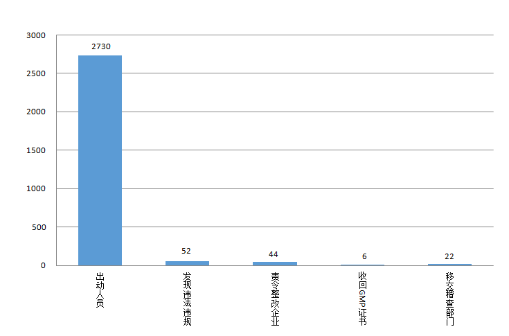 图4-2-1 2017年全省药品审批情况分布图 三、药品生产企业GMP认证情况2017年,本期认证证书89张,期末实有GMP证书577张;本期通过GMP认证企业89家,期末实有通过GMP认证企业444家。 四、药品GSP检查员情况2017年,具有资格人数354人,全部可从事检查工作。按学历划分,硕士研究生及以上17人,大学本科253人,大学大专84人;按职称划分,高级30人,中级5人,初级120人;按所在单位划分,行政机关305人,药品检验所43人,认证中心4人,其他单位2人。本年总检查次数789人次。 五、药品生产企业日常监管情况2017年,全省共检查生产企业3633家次。出动检查人员11523人次,发现违法违规生产企业299家次,责令整改生产企业378家次,收回GMP证书7张,移交稽查部门立案查处47家。