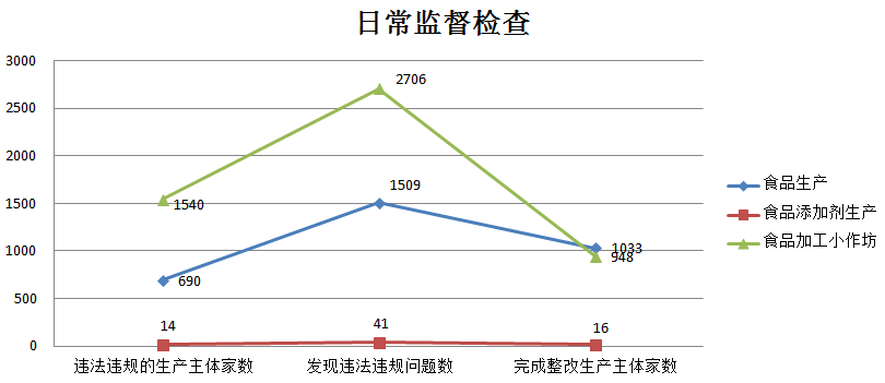 (二)食品日常监管情况1、食品生产环节日常监管情况 2018年上半年,全省日常监管工作中,共检查食品生产企业11514家、食品添加剂生产企业149家、食品加工小作坊22708家。出动检查人员83098人次,其中食品生产企业34166人次,食品添加剂生产企业630人次,食品加工小作坊48302人次。快检生产主体数2156家次,其中食品生产企业1025家次,食品添加剂生产企业1家次,快检食品加工小作坊1130家次;快检食品批次数5371批次,其中食品生产企业3347批次,食品添加剂生产企业1批次,快检食品加工小作坊2023批次;快检不合格食品批次数158批次,其中食品生产企业69批次,快检食品加工小作坊89批次。 日常监督检查中发现违法违规的生产主体数2244家次,其中食品生产企业690家次,食品添加剂生产企业14家次,食品加工小作坊1540家次;发现违法违规问题数4256个,其中食品生产企业1509个,食品添加剂生产企业41个,食品加工小作坊2706个;完成整改生产主体数2843家次,其中食品生产企业1033家次,食品添加剂生产企业16家次,食品加工小作坊948家次。